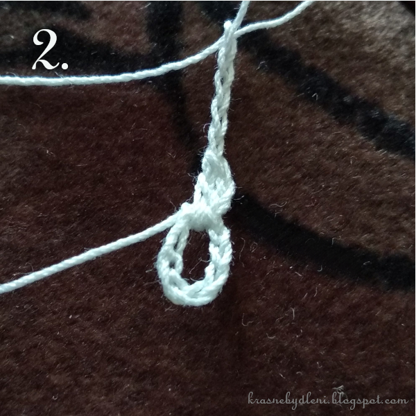 1ŘO místo prvního KS, 7ŘO, 1DS pod střed řetízku, 4ŘO, 1DS opět pod střed řetízku, 7ŘO; poté opakujeme 8x [1KS do KS, 7ŘO, 1DS pod střed řetízku, 4ŘO, 1DS opět pod střed řetízku, 7ŘO], spojíme s prvním ŘO pomocí 1PO.
