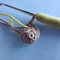 Od druhého oka od háčku háčkujeme 5KS vyměnit na hnědou přízi 5ŘO, 1PO do prvního ŘO |